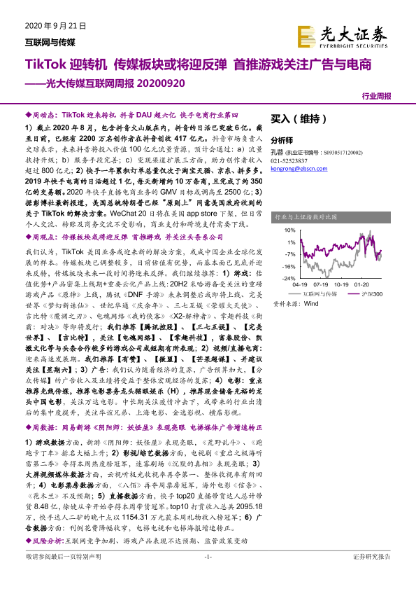 【光大证券】【20200920】20200920-光大证券-传媒互联网周报:TikTok迎转机 传媒板块或将迎反弹 首推游戏关注广告与电商-14页