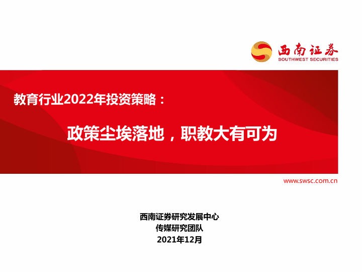 【西南证券】【202112】教育行业2022年投资策略:政策尘埃落地,职教大有可为-27页