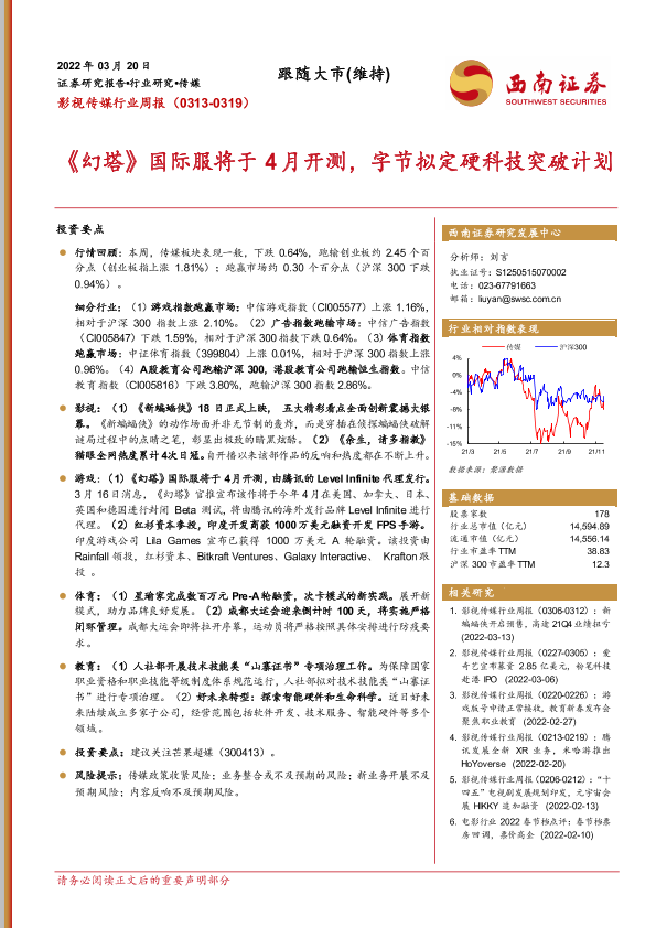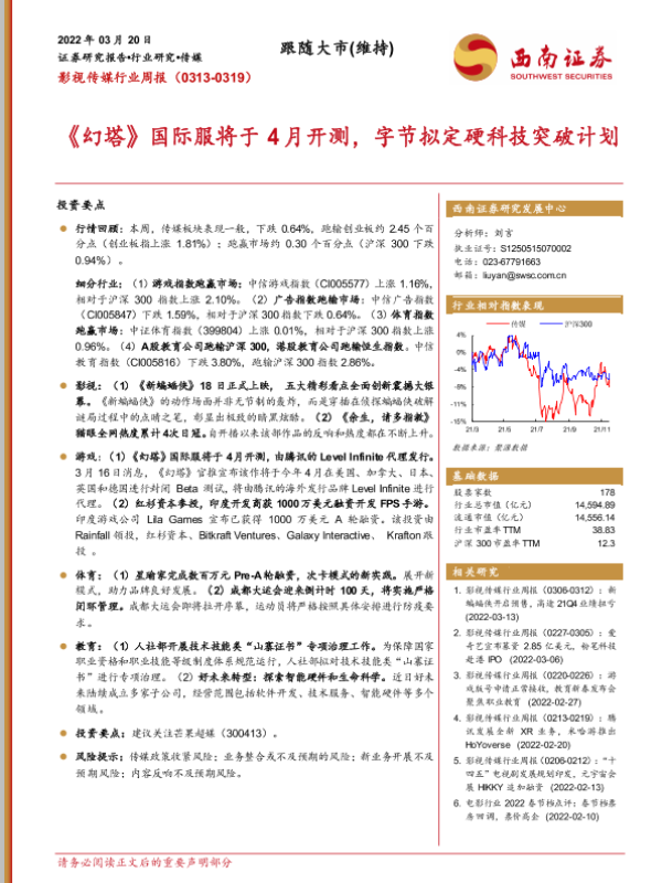 【西南证券】【20220320】影视传媒行业周报:《幻塔》国际服将于4月开测,字节拟定硬科技突破计划-18页