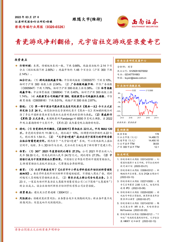【西南证券】【20220327】影视传媒行业周报:青瓷游戏净利翻倍,元宇宙社交游戏登录爱奇艺-18页