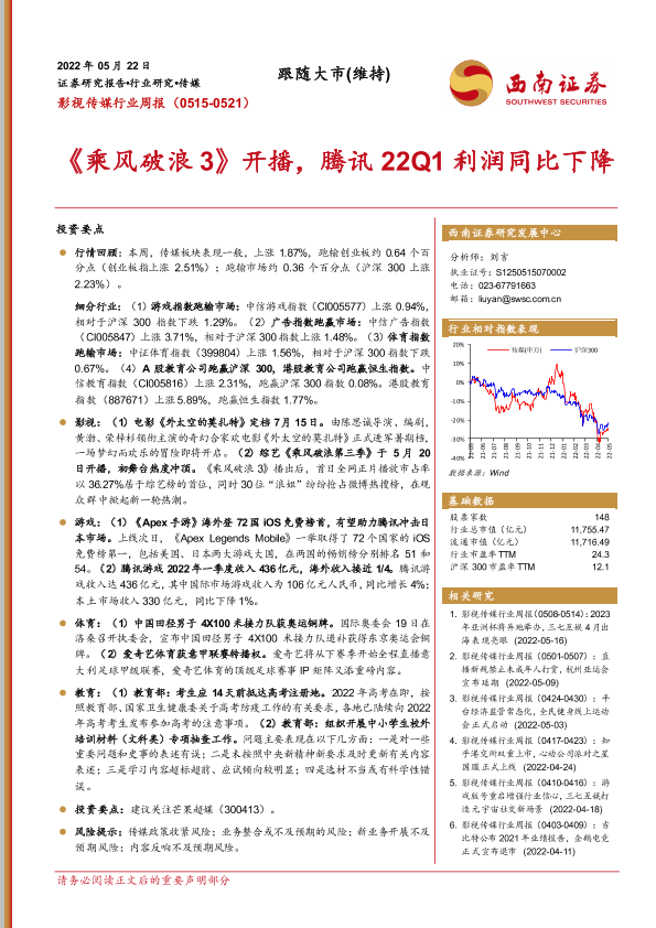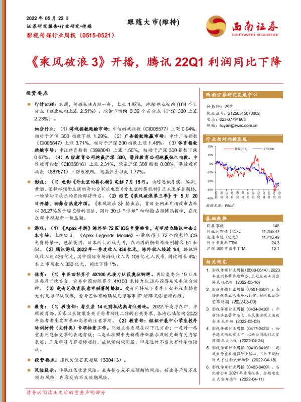 【西南证券】【20220522】影视传媒行业周报:《乘风破浪3》开播,腾讯22Q1利润同比下降-20页