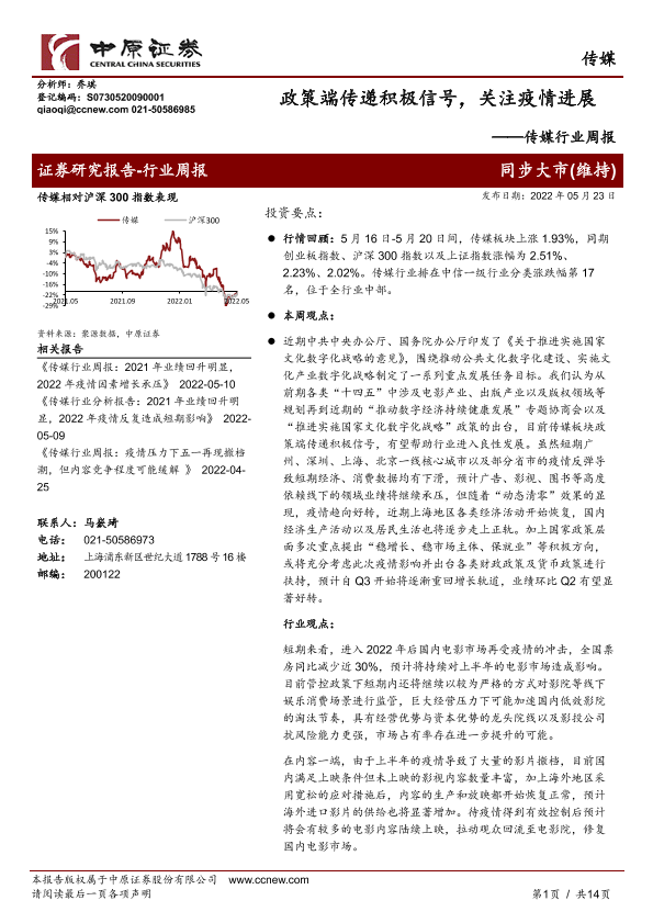 【中原证券】【20220523】传媒行业周报:政策端传递积极信号,关注疫情进展-14页