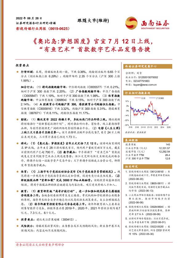 【西南证券】【20220626】影视传媒行业周报:《奥比岛 梦想国度》官宣7月12日上线,“有鱼艺术”首款数字艺术品发售告捷-18页