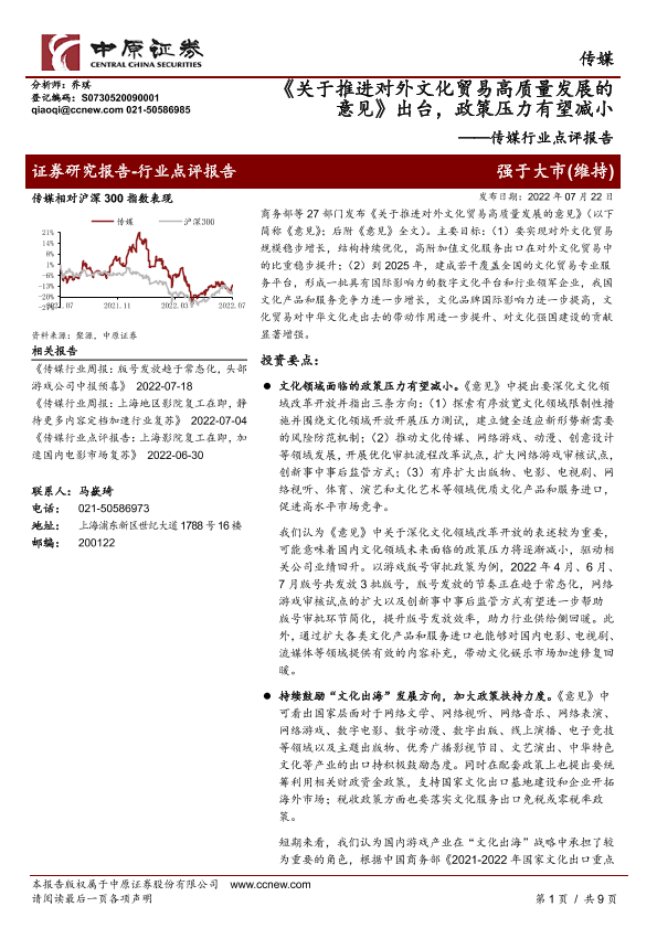 【中原证券】【20220722】关于推进对外文化贸易高质量发展的意见出台,政策压力有望减小-9页