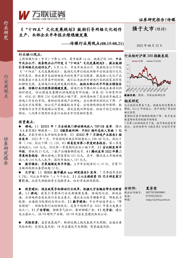 【万联证券】【20220822】“十四五”文化发展规划鼓励引导网络文化创作生产,头部企业半年报业绩稳健发展-16页