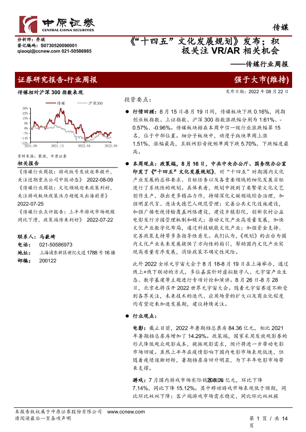 【中原证券】【20220822】传媒行业周报:“十四五”文化发展规划发布;积极关注VR AR相关机会-14页