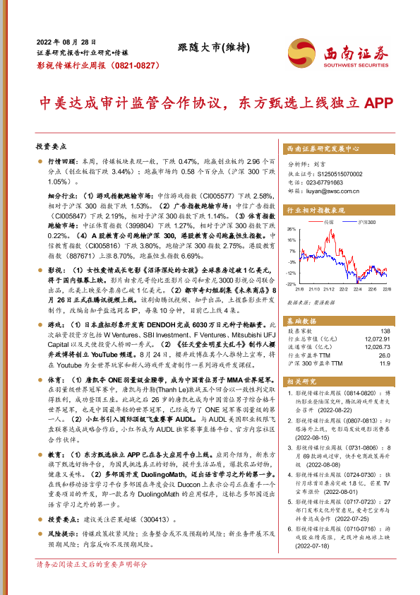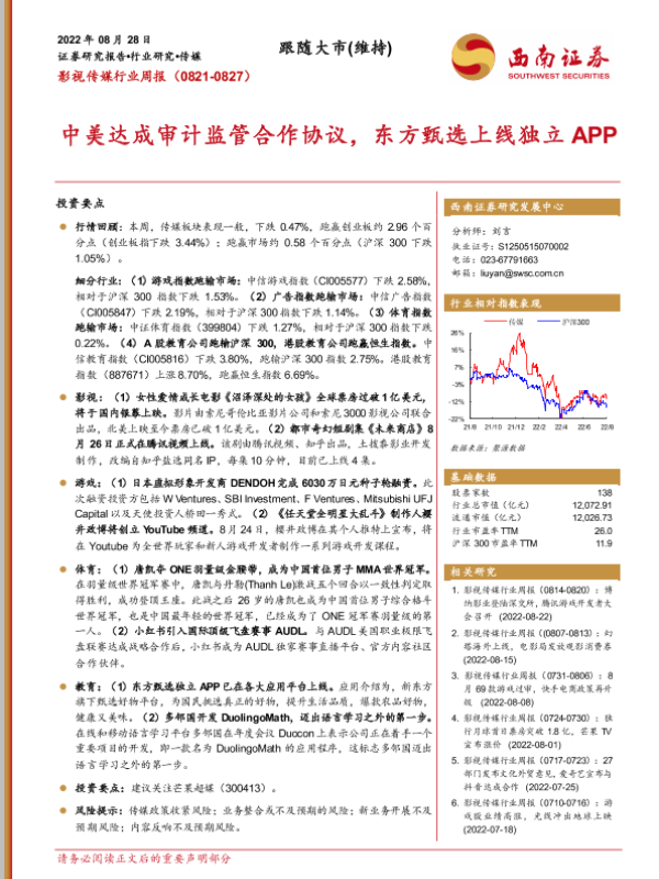 【西南证券】【20220828】影视传媒行业周报:中美达成审计监管合作协议,东方甄选上线独立APP-18页