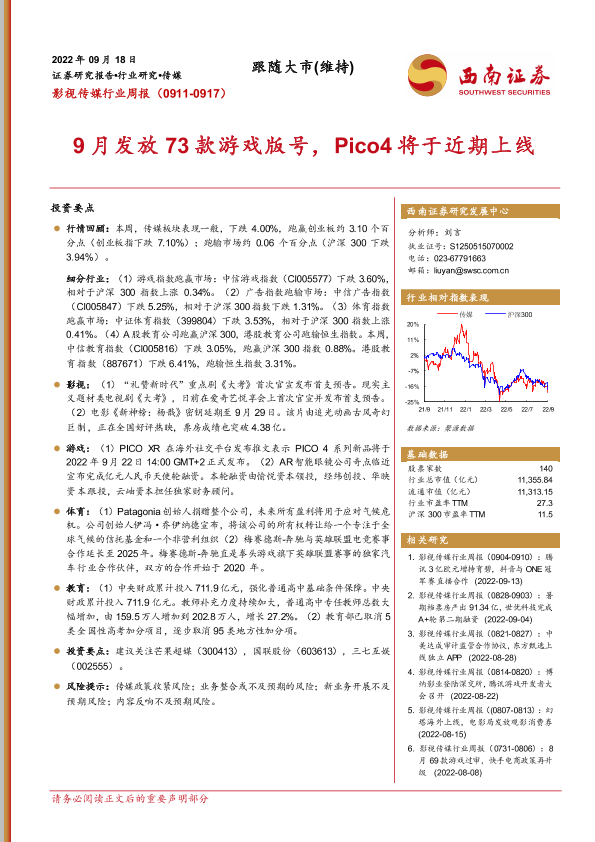 【西南证券】【20220918】影视传媒行业周报:9月发放73款游戏版号,Pico4将于近期上线-19页