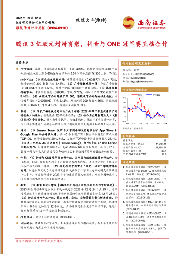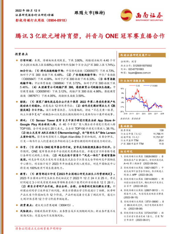 【西南证券】【20220912】影视传媒行业周报:腾讯3亿欧元增持育碧,抖音与ONE冠军赛直播合作-18页
