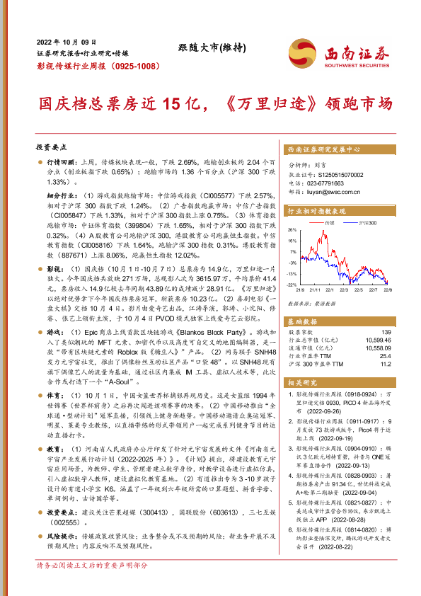 【西南证券】【20221009】影视传媒行业周报:国庆档总票房近15亿,《万里归途》领跑市场-18页