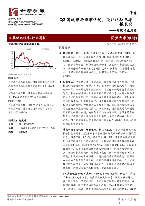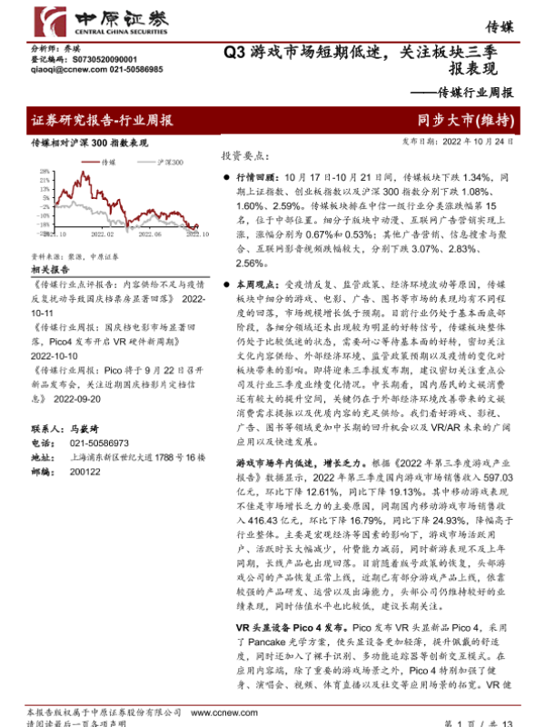 【中原证券】【20221024】Q3游戏市场短期低迷,关注板块三季报表现-13页