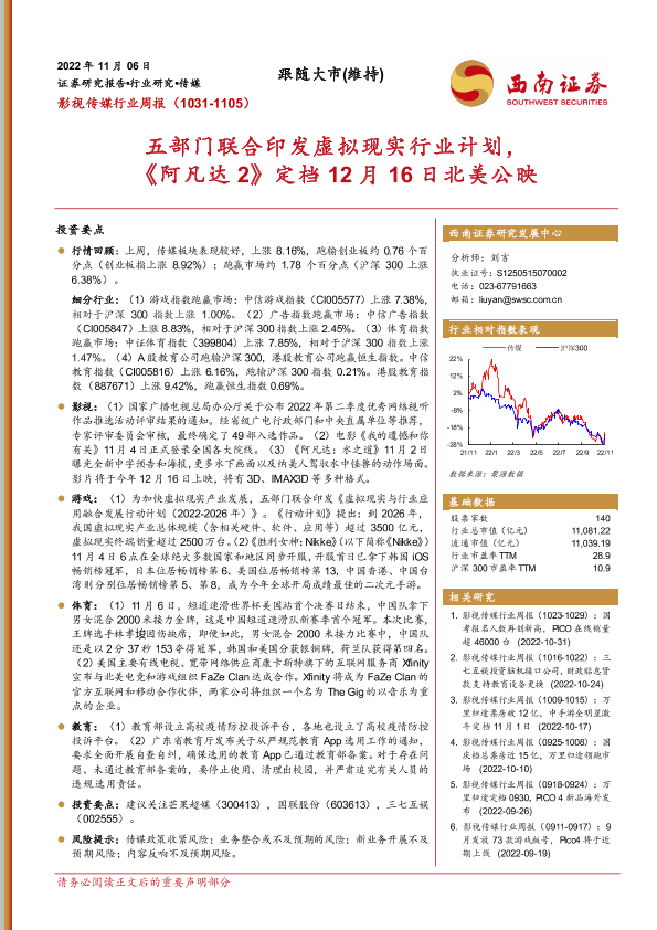 【西南证券】【20221106】影视传媒行业周报:五部门联合印发虚拟现实行业计划,《阿凡达2》定档12月16日北美公映-17页
