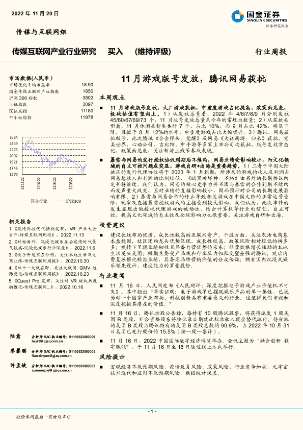 【国金证券】【20221120】传媒互联网产业行业周报:11月游戏版号发放,腾讯网易获批-21页