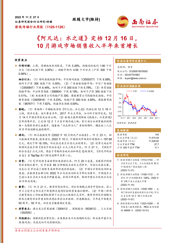 【西南证券】【20221127】影视传媒行业周报:《阿凡达:水之道》定档12月16日,10月游戏市场销售收入半年来首增长-20页