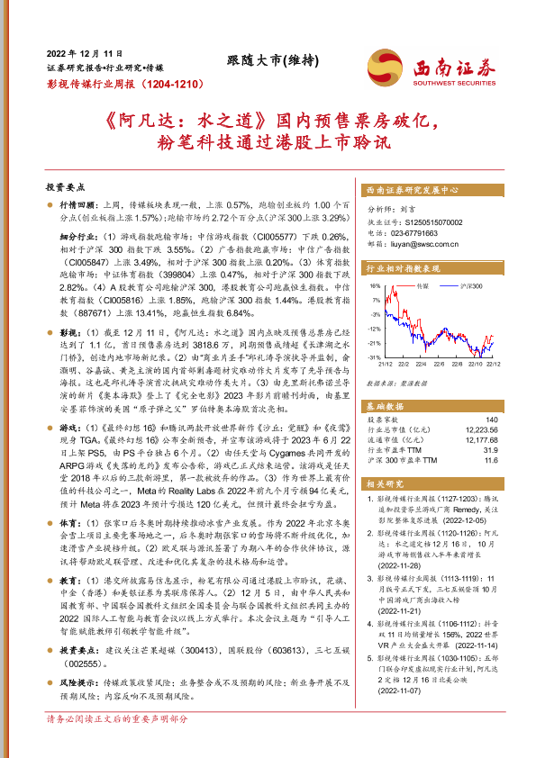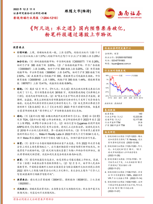 【西南证券】【20221211】影视传媒行业周报:《阿凡达:水之道》国内预售票房破亿,粉笔科技通过港股上市聆讯-19页