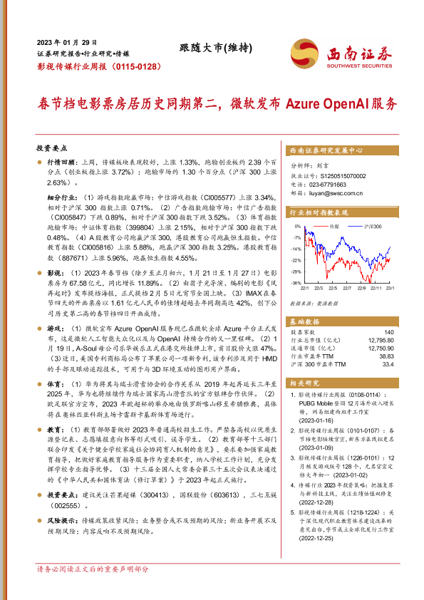 【西南证券】【20230129】影视传媒行业周报:春节档电影票房居历史同期第二,微软发布Azure OpenAI服务-19页