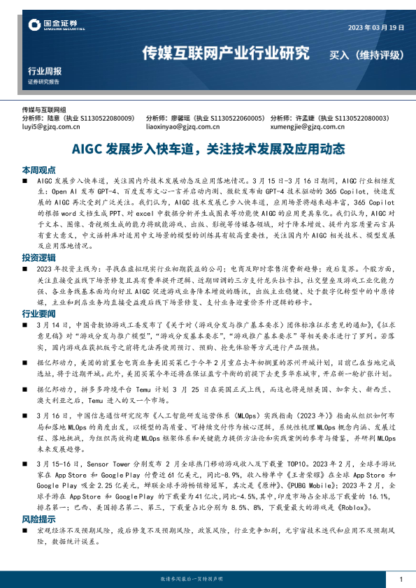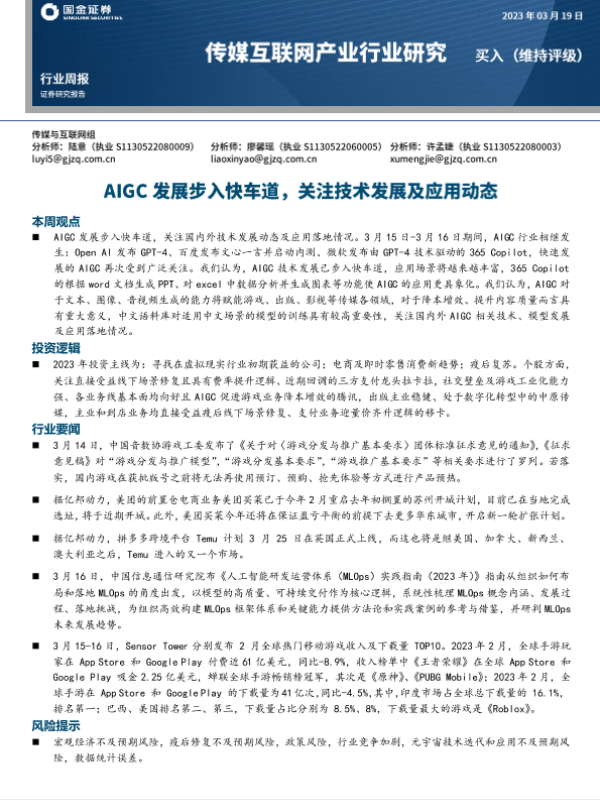 【国金证券】【20230319】AIGC发展步入快车道,关注技术发展及应用动态-17页