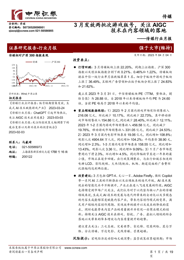 【中原证券】【20230404】3月发放两批次游戏版号,关注AIGC技术在内容领域的落地-19页