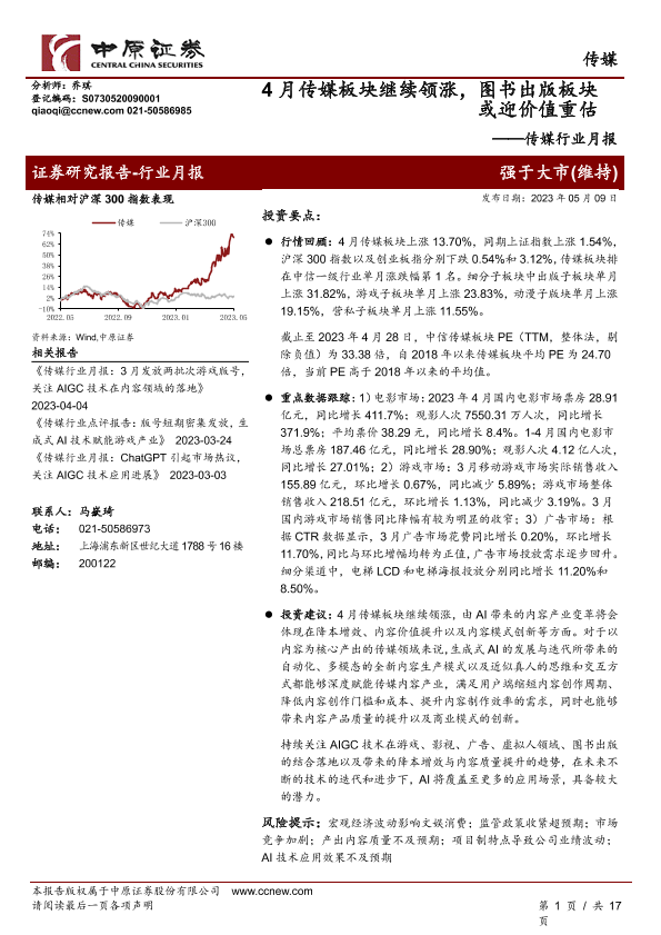 【中原证券】【20230509】4月传媒板块继续领涨,图书出版板块或迎价值重估-17页