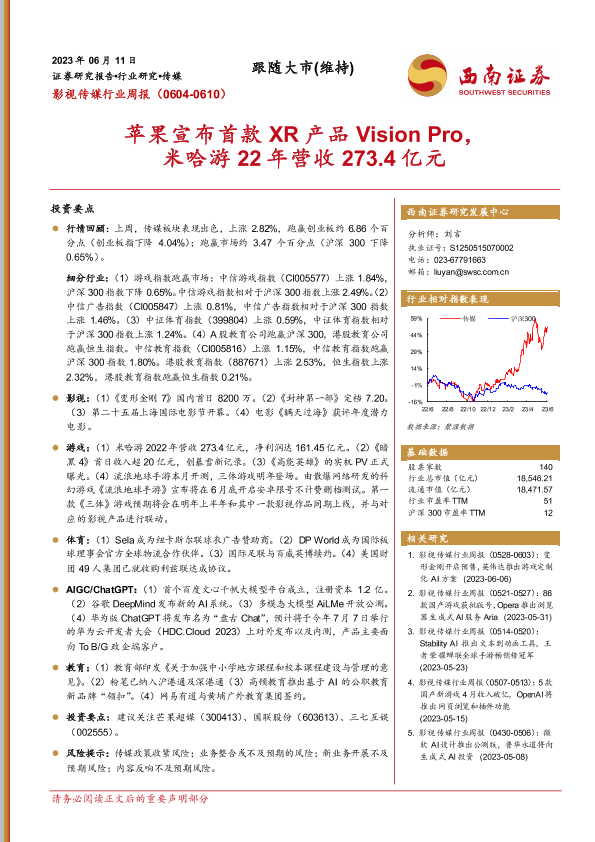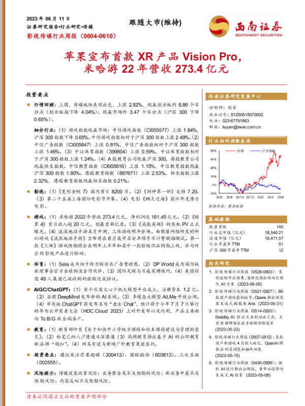 【西南证券】【20230611】影视传媒行业周报:苹果宣布首款XR产品Vision Pro,米哈游22年营收273.4亿元-18页