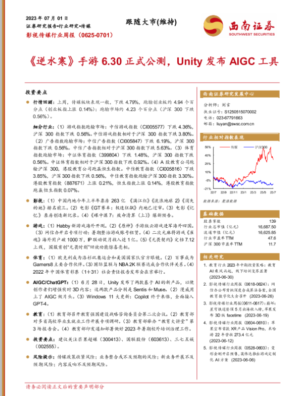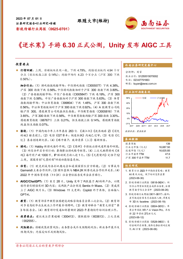 【西南证券】【20230701】影视传媒行业周报:《逆水寒》手游6.30正式公测,Unity发布AIGC工具-19页