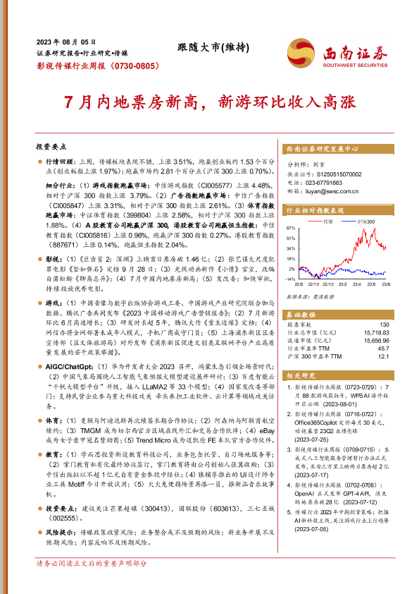 【西南证券】【20230805】影视传媒行业周报:7月内地票房新高,新游环比收入高涨-20页
