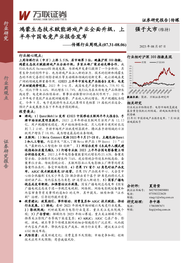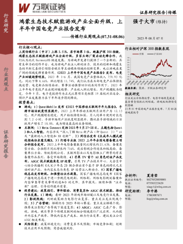 【万联证券】【20230807】传媒行业周观点:鸿蒙生态技术赋能游戏产业全面升级,上半年中国电竞产业报告发布-14页