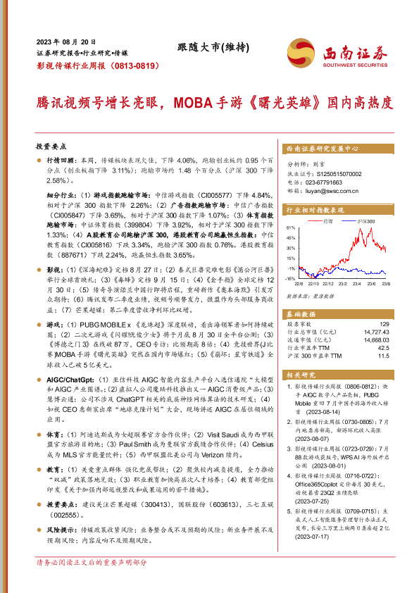 【西南证券】【20230820】影视传媒行业周报:腾讯视频号增长亮眼,MOBA手游《曙光英雄》国内高热度-19页