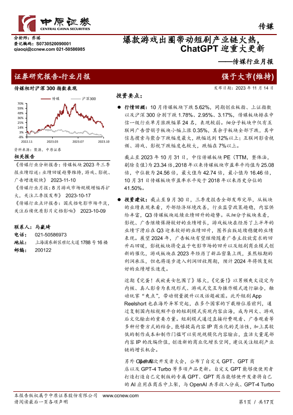 【中原证券】【20231114】传媒行业月报:爆款游戏出圈带动短剧产业链火热,ChatGPT迎重大更新-17页