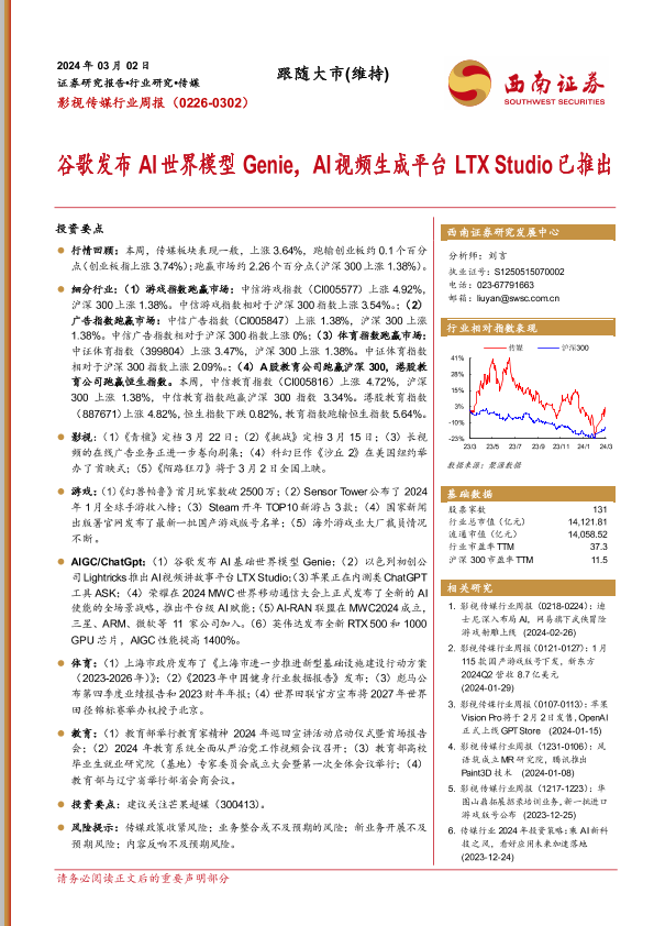 【西南证券】【20240302】影视传媒行业周报:谷歌发布AI世界模型Genie,AI视频生成平台LTX Studio已推出-19页
