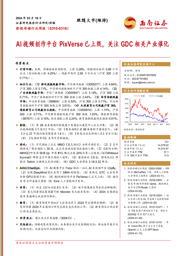 【西南证券】【20240316】影视传媒行业周报:AI视频创作平台PixVerse已上线,关注GDC相关产业催化-19页