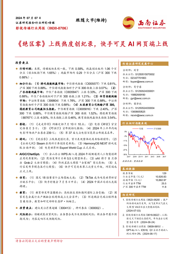 【西南证券】【20240707】影视传媒行业周报:《绝区零》上线热度创纪录,快手可灵AI网页端上线-19页