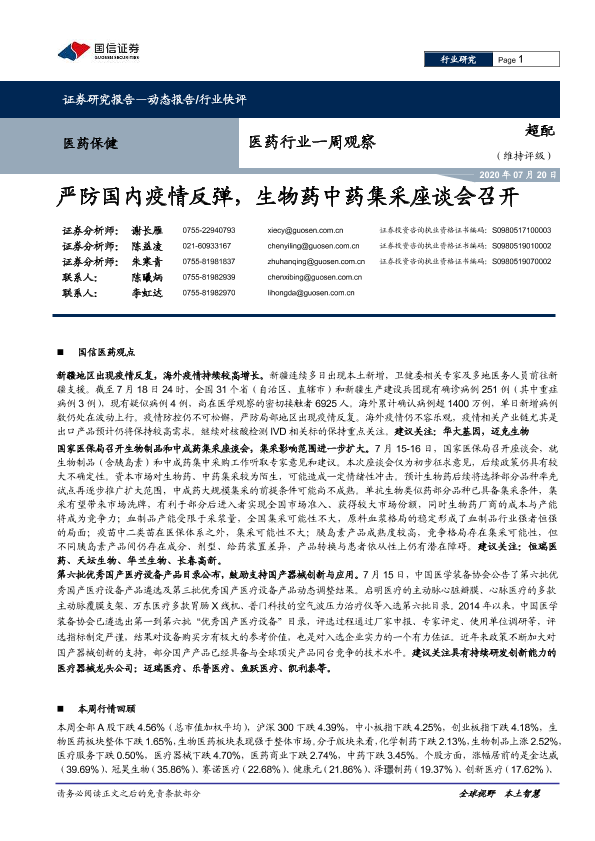 【国信证券】【20200720】医药行业一周观察:严防国内疫情反弹,生物药中药集采座谈会召开-8页