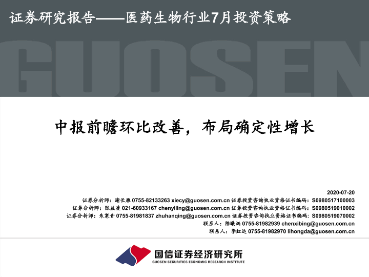 【国信证券】【20200720】医药生物行业7月投资策略:中报前瞻环比改善,布局确定性增长-28页