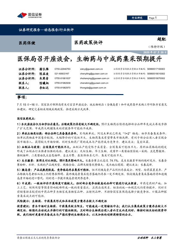 【国信证券】【20200720】医药政策快评:医保局召开座谈会,生物药与中成药集采预期提升-12页