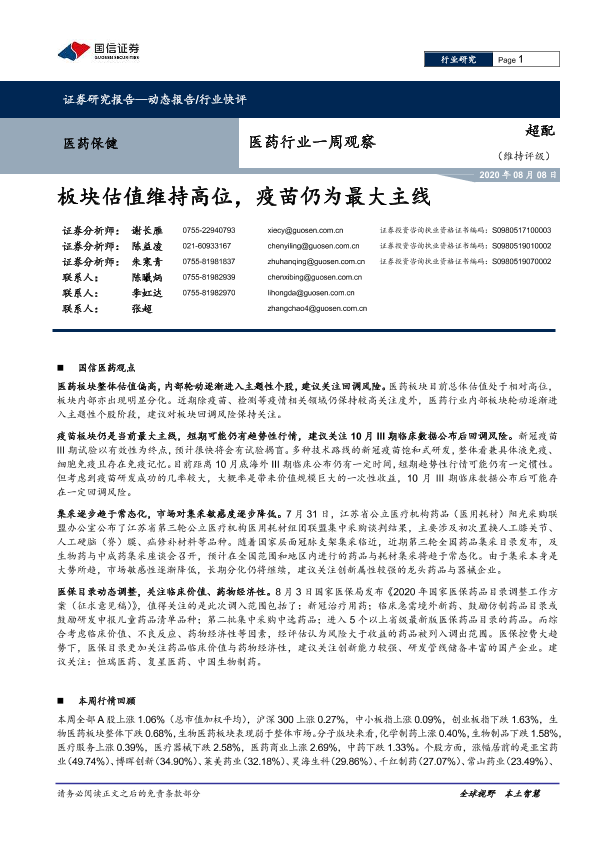 【国信证券】【20200808】医药行业一周观察:板块估值维持高位,疫苗仍为最大主线-12页