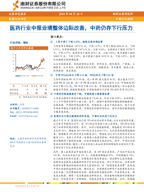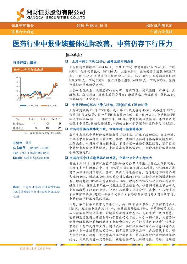 【湘财证券】【20200820】中药行业周报:医药行业中报业绩整体边际改善,中药仍存下行压力-12页