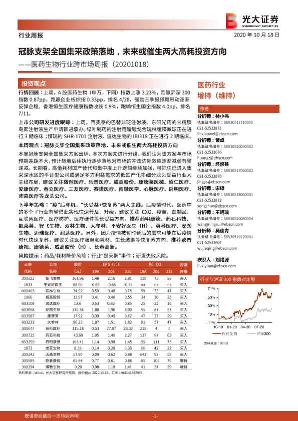 【光大证券】【20201018】医药生物行业跨市场周报:冠脉支架全国集采政策落地,未来或催生两大高耗投资方向-34页