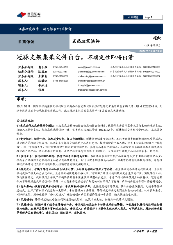 【国信证券】【20201019】医药政策快评:冠脉支架集采文件出台,不确定性即将出清-9页
