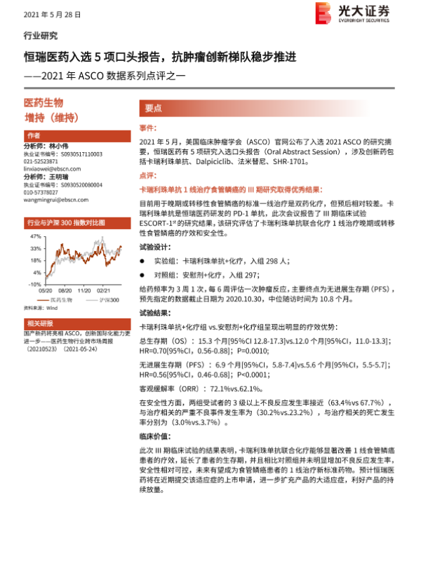 【光大证券】【20210528】2021年ASCO数据系列点评之一:恒瑞医药入选5项口头报告,抗肿瘤创新梯队稳步推进-5页