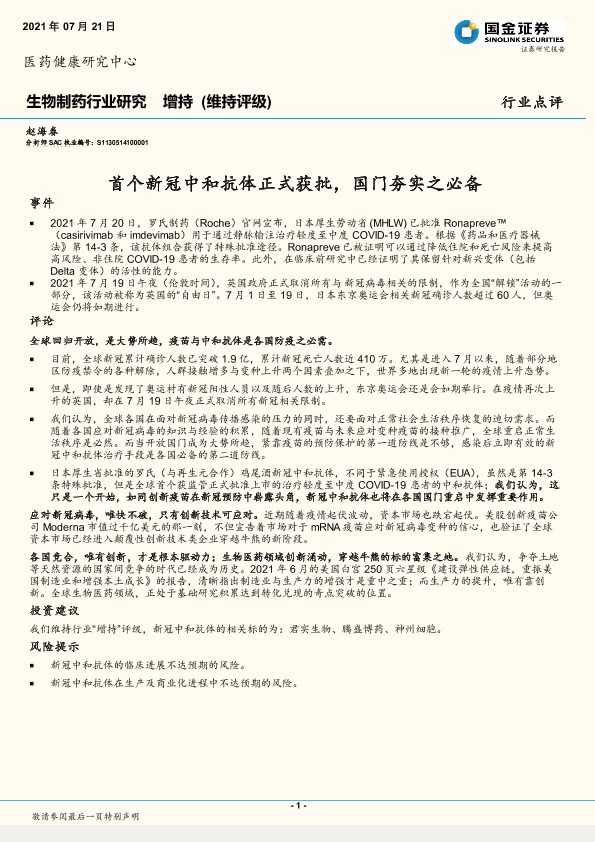 【国金证券】【20210721】首个新冠中和抗体正式获批,国门夯实之必备-5页