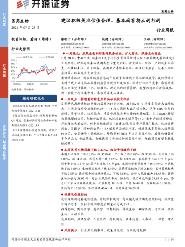 【开源证券】【20210725】医药生物行业周报:建议积极关注估值合理、基本面有拐点的标的-14页