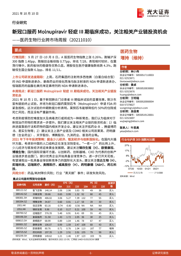 【光大证券】【20211010】医药生物行业跨市场周报:新冠口服药Molnupiravir轻症III期临床成功,关注相关产业链投资机会-27页