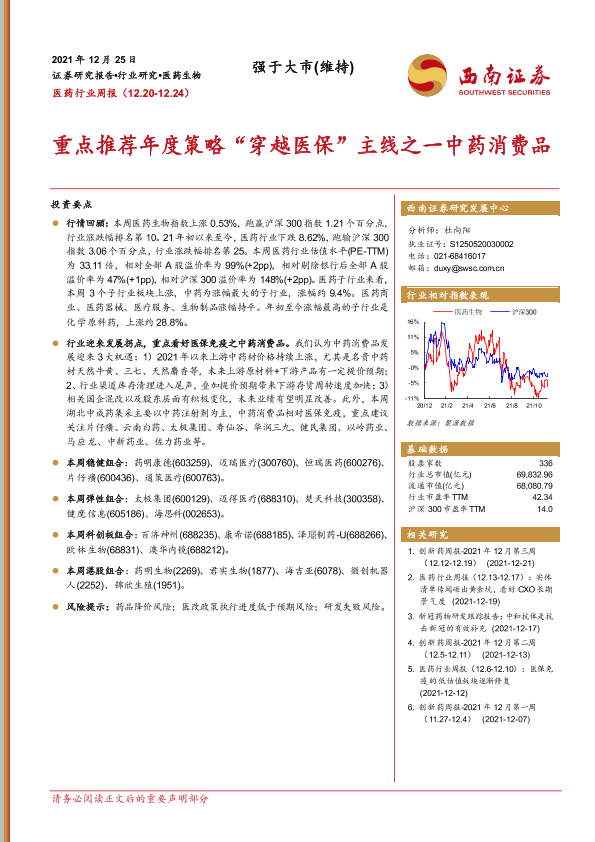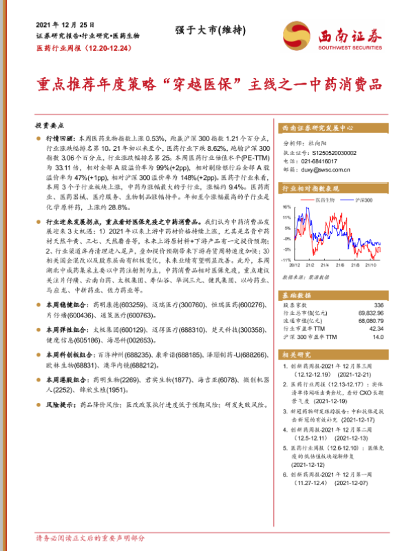 【西南证券】【20211225】医药行业周报:重点推荐年度策略“穿越医保”主线之一中药消费品-37页
