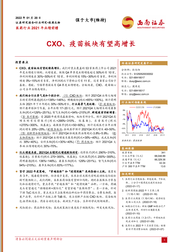 【西南证券】【20220120】医药行业2021年业绩前瞻:CXO、疫苗板块有望高增长-6页