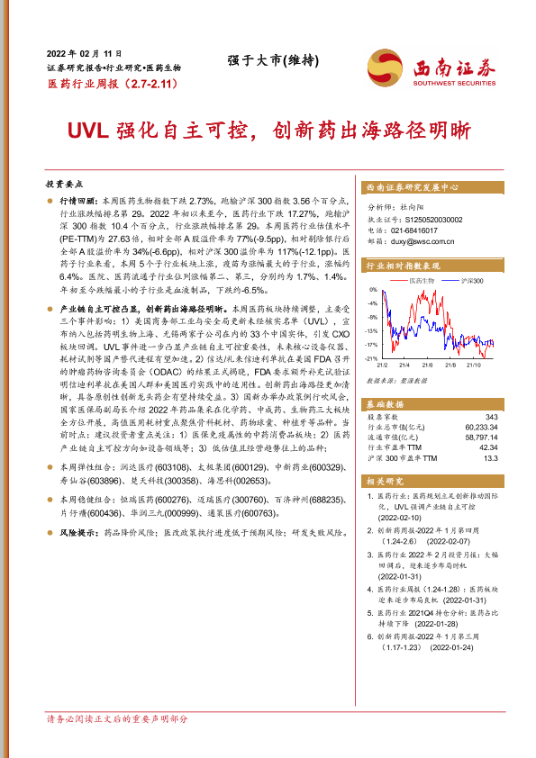 【西南证券】【20220211】医药行业周报:UVL强化自主可控,创新药出海路径明晰-38页