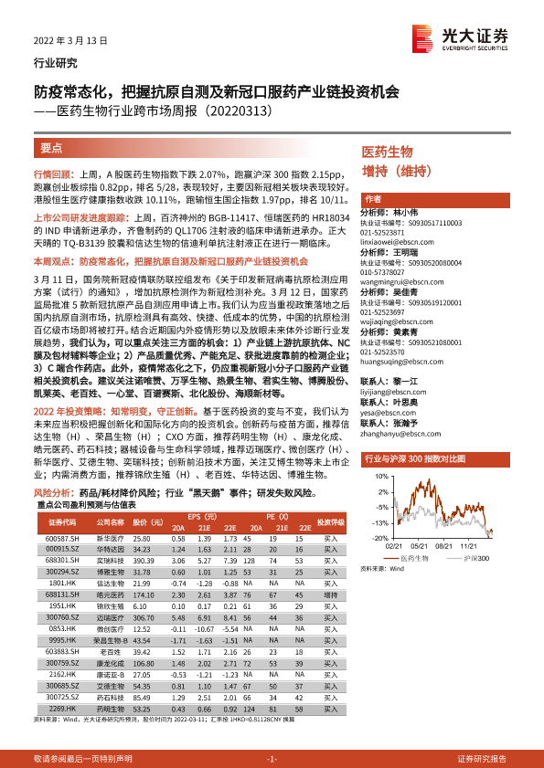 【光大证券】【20220313】医药生物行业跨市场周报:防疫常态化,把握抗原自测及新冠口服药产业链投资机会-26页
