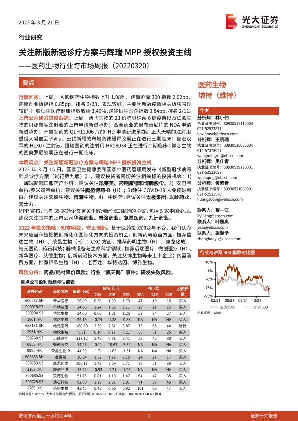 【光大证券】【20220321】医药生物行业跨市场周报:关注新版新冠诊疗方案与辉瑞MPP授权投资主线-24页