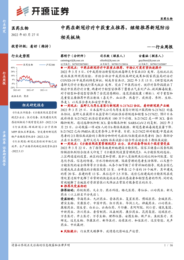 【开源证券】【20220327】中药在新冠诊疗中获重点推荐,继续推荐新冠防治相关板块-16页