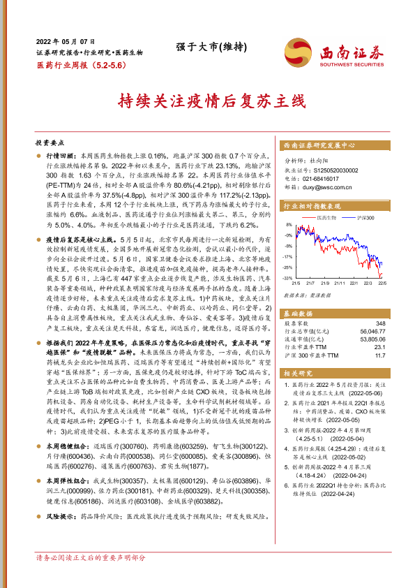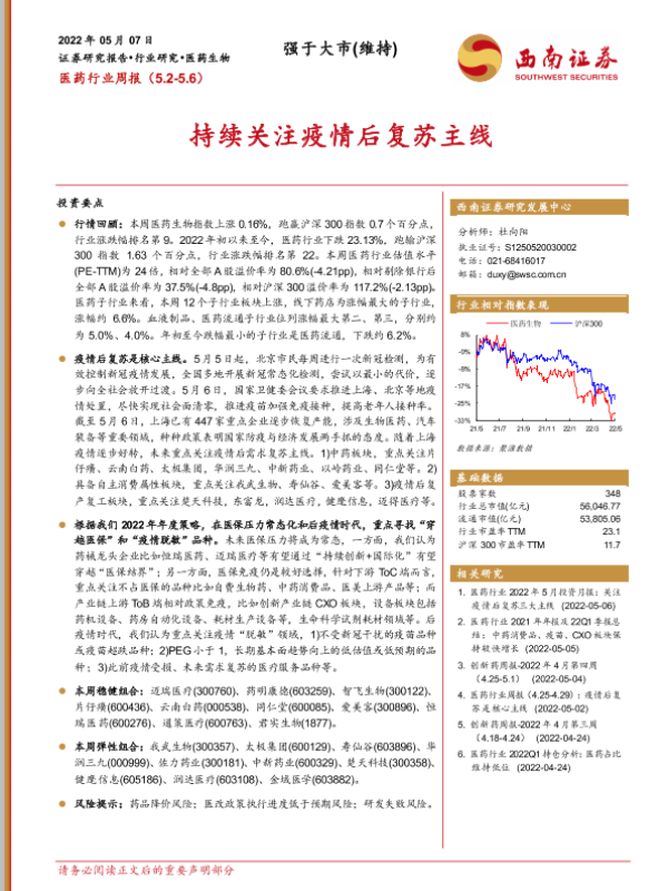 【西南证券】【20220507】医药行业周报:持续关注疫情后复苏主线-44页